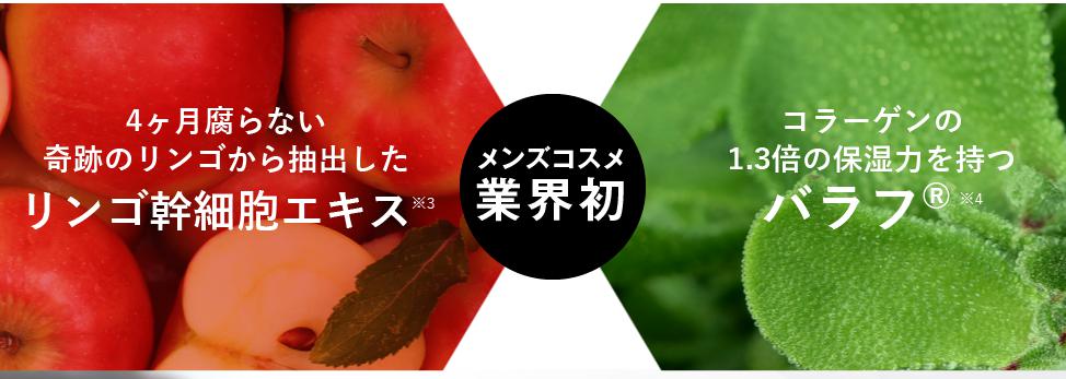 4ヶ月腐らないとされる奇跡のリンゴから抽出の『リンゴ幹細胞エキス』と、コラーゲンの1.3倍の保湿力を持つ『バラフ(R)』をメンズコスメ業界初配合。今までのスキンケアで満足できなかったモデル・芸能人に愛用者多数!