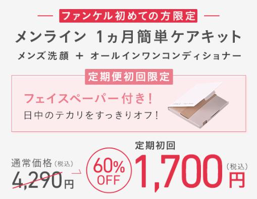 ファンケルはじめての方限定、メンライン1ヵ月簡単ケアキットが定期初回60%OFFの1700円。